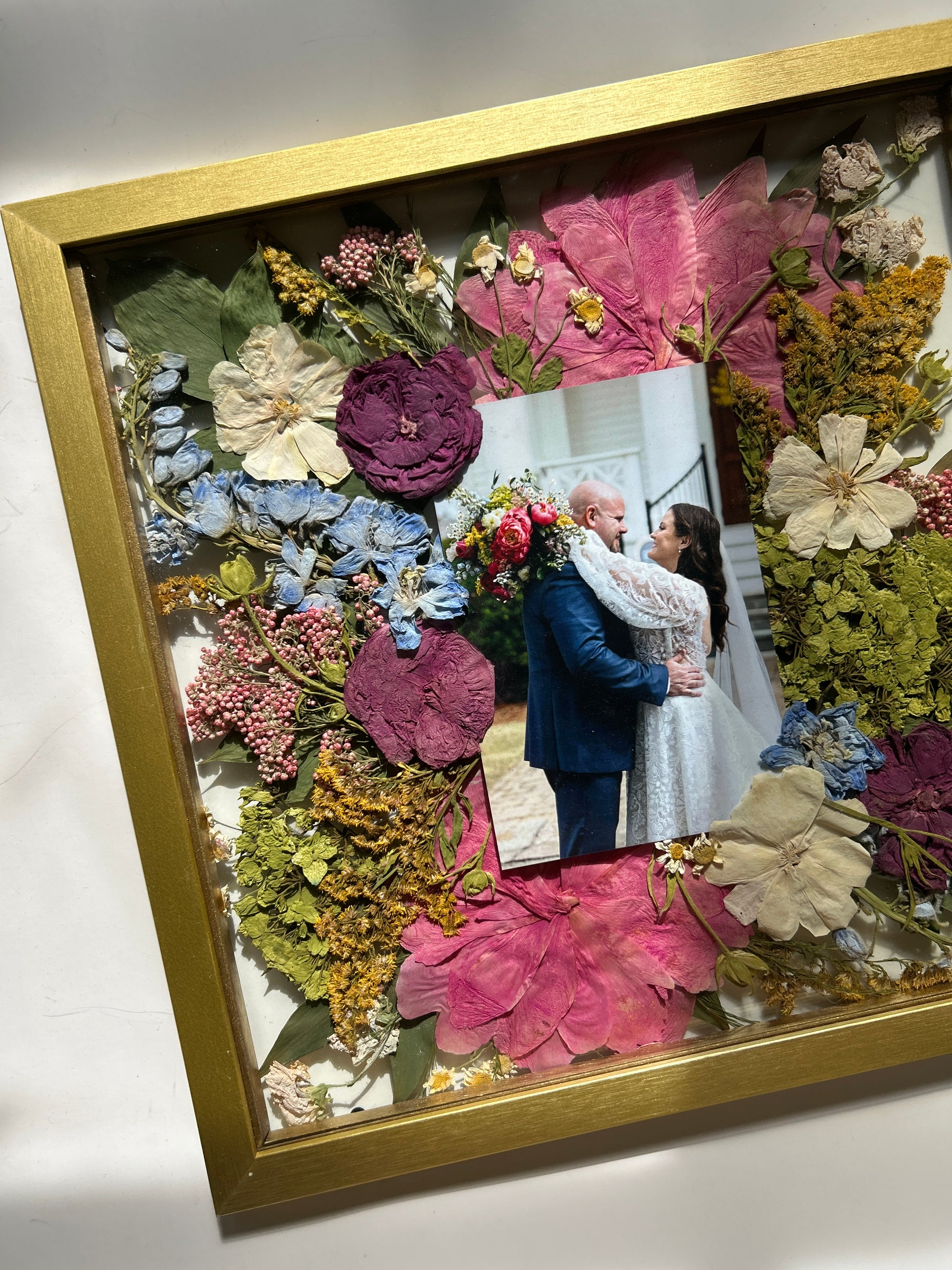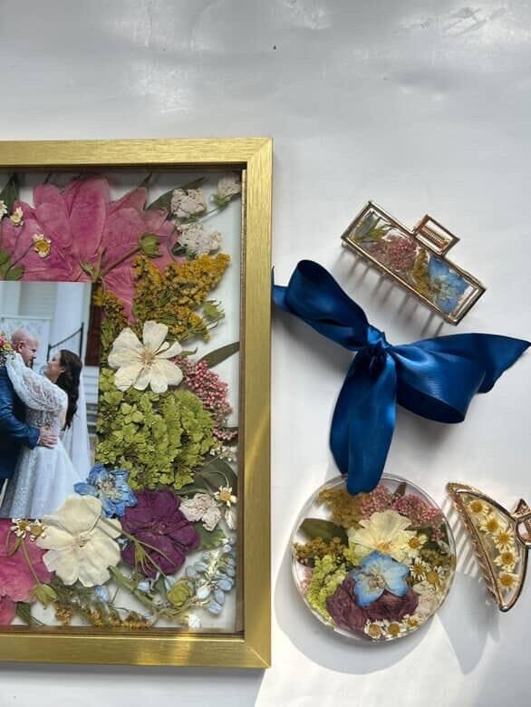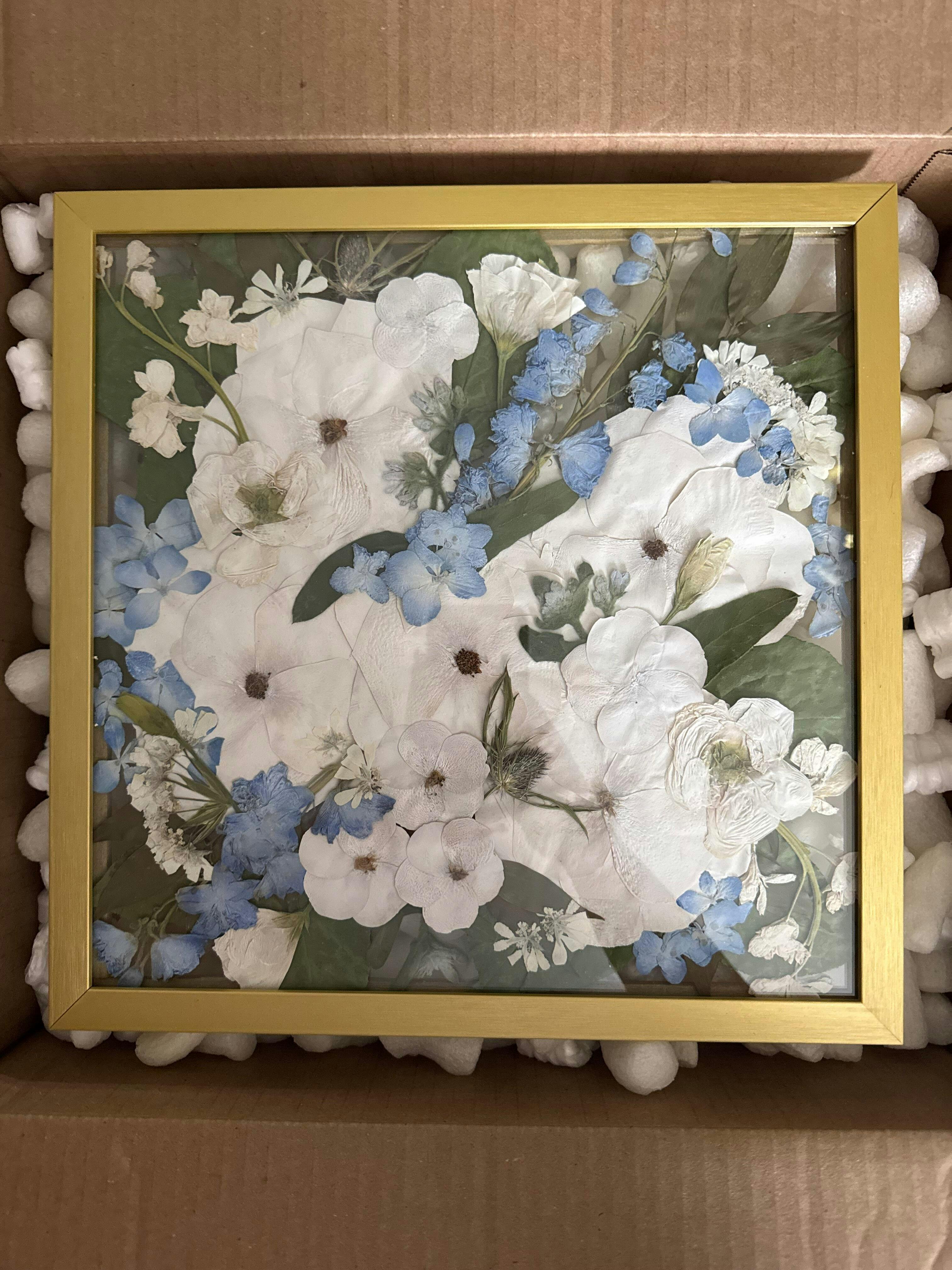 Mariannah is such a lovely woman to work with! I booked with her literally the week of my wedding and we were able to coordinate drop off on our way to our honeymoon. I also had an idea for a resin ring holder she did not have; she was able to source the mold and make the piece for me. It turned out beautifully! My frame was so well crafted and my bouquet came out so well. I ordered an ornament as well and cannot wait to see it on our tree year after year. Thank you, Mariannah!!